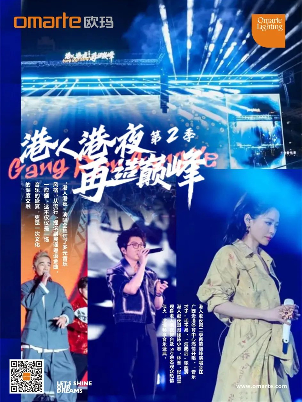 演唱會現(xiàn)場燈光由歐瑪燈光提供,整場演出采用了歐瑪旗艦產(chǎn)品MOORE 230W光束燈,380W光束燈,1500W搖頭燈系列的染色燈、圖案燈等產(chǎn)品近300臺。