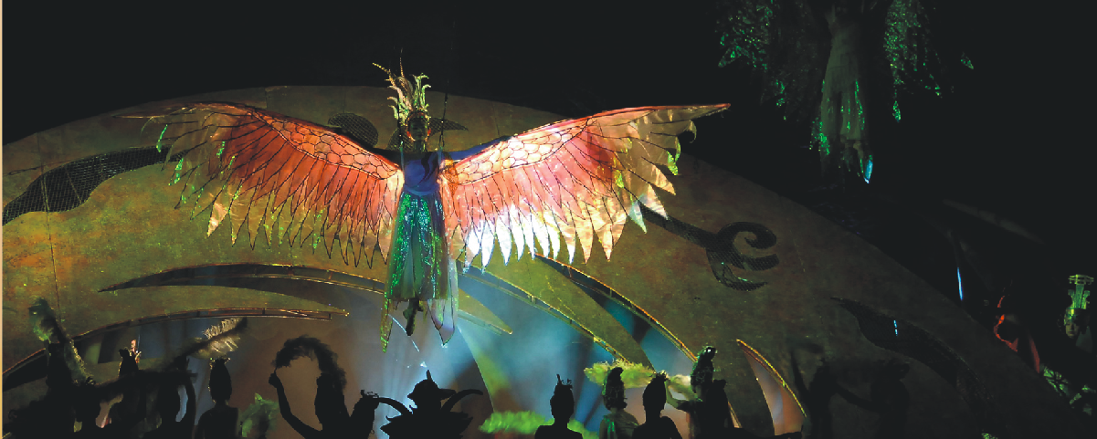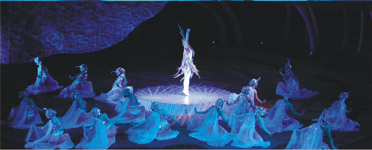 大型音樂舞蹈《太陽神鳥》是一臺詮釋千年珍寶深刻內涵的舞臺藝術力作,舞美燈光設計充滿神秘色彩,
