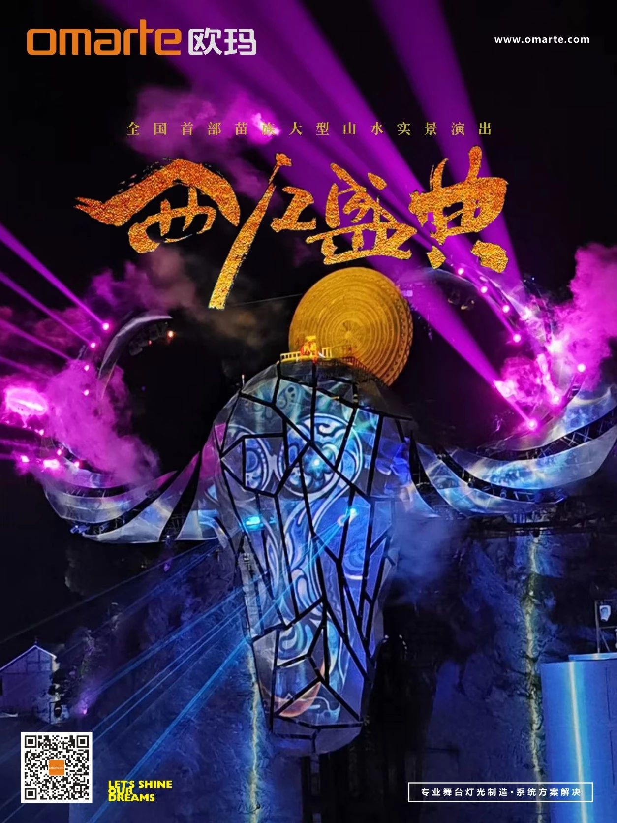 數(shù)千臺OMARTE歐瑪燈具綻放出無限絢麗的色彩,每個燈具的使用都經(jīng)過了嚴格的測量和考慮,燈光的交錯排列豐富了舞臺的層次感,搭配卓越的舞臺特技、恢弘的音樂,多媒體等技術(shù)手段,藝術(shù)再現(xiàn)“序幕·頌、祖·英雄、魂·跋涉、夢·家園、尾聲·歌”五幕場景,詮釋了真摯而深重的苗族文化魅力,展示出一部苗族人民守護家園的氣勢磅礴的英雄史詩。