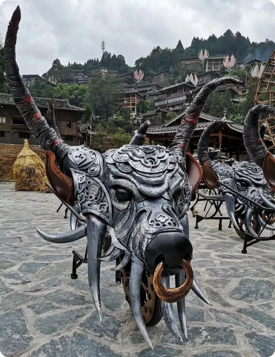 一部心史鑄魂魄,一曲長歌頌家園。《西江盛典》以山水實景苗族村落雞鳩苗寨為舞臺背景,以村民生產(chǎn)生活用品為舞臺道具,結(jié)合大塘景區(qū)的地貌山形,構(gòu)成了舞臺劇場,真實再現(xiàn)了原生態(tài)。山體上,懸掛著的巨型牛頭;半山腰,一架紡織機,織出一條銀河之路散落山間;山腳下,聳立著壯觀的四面銅鼓群;村落中,遍布著25盞蓮花燈;清河邊的大水車旁,是有著600多年歷史的獨特建筑“水上糧倉”。