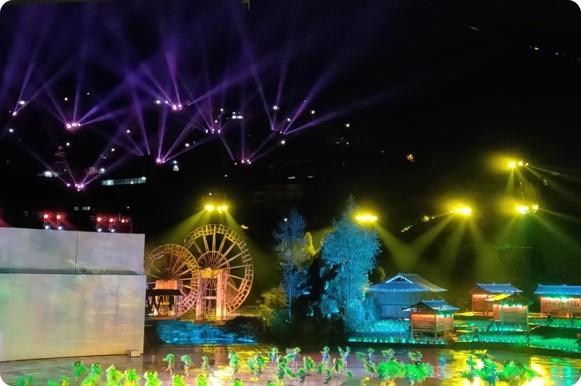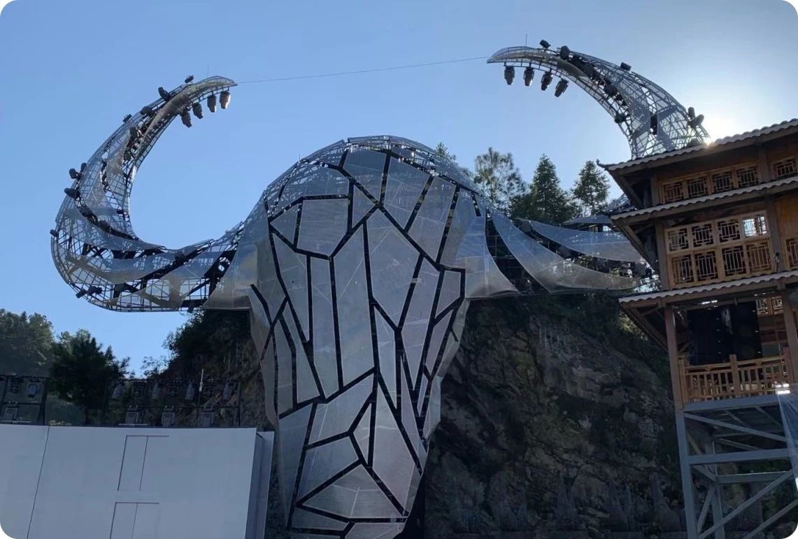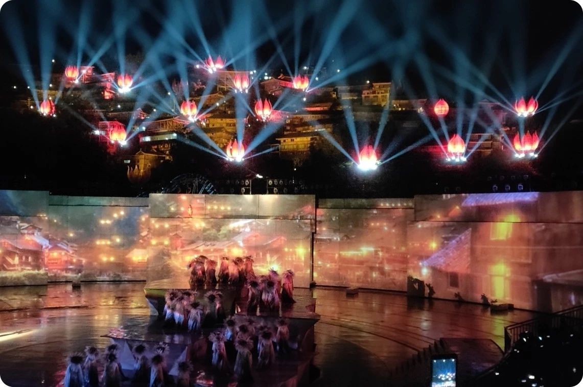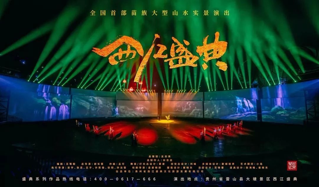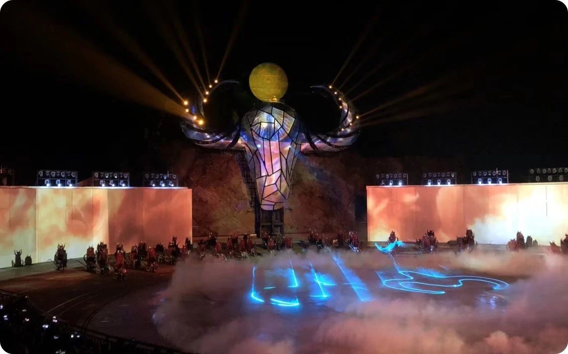 一首歌抒發(fā)一種情懷,一部戲還原一段歷史,整場演出燈光的處理正是將這種情懷、這段歷史傳遞給每一位觀眾,用光來訴說古老而神秘的苗族文化。《西江盛典》在占地面積9000平米的舞臺上, 360度移動裝置的觀眾席,能夠最大限度的讓觀眾觀看超過360度的演出內(nèi)容,結(jié)合舞臺八塊景片環(huán)形幕、數(shù)千臺燈光、大型牛頭裝置、大型機械鐵花、苗族山水實景與升降舞臺演出,《西江盛典》震撼你的,不僅僅是演出,更是一場聲光電科技完美配合的視覺盛宴和厚重的苗族文化積淀。