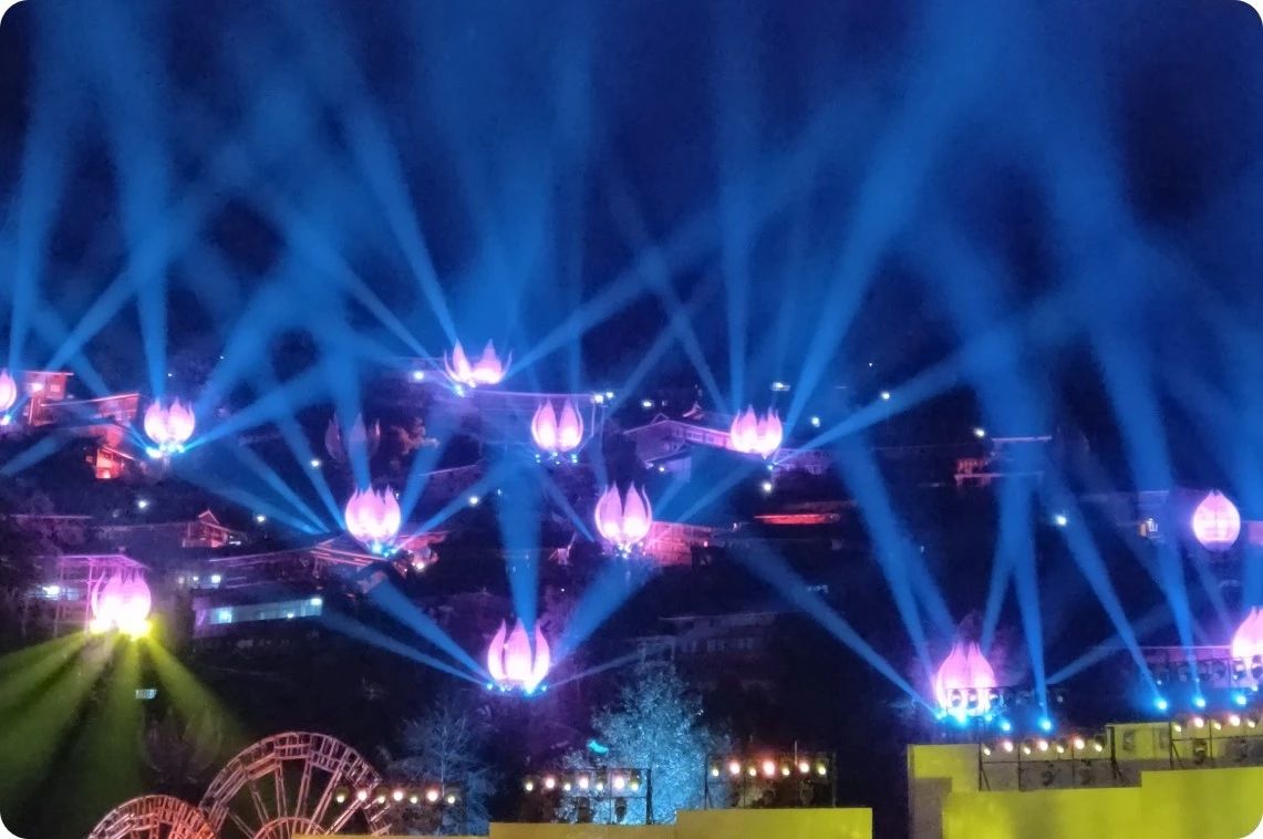 OMARTE歐瑪為《西江盛典》提供演出燈光設(shè)備和山體蓮花燈造型設(shè)計安裝。根據(jù)氣候特點和劇情需求,燈光總設(shè)計蒙秦老師采用了大量歐瑪LED光源戶外防水系列燈具,主要是: