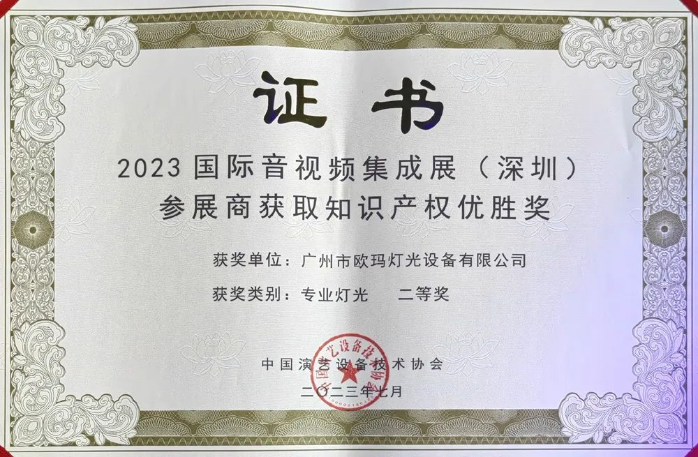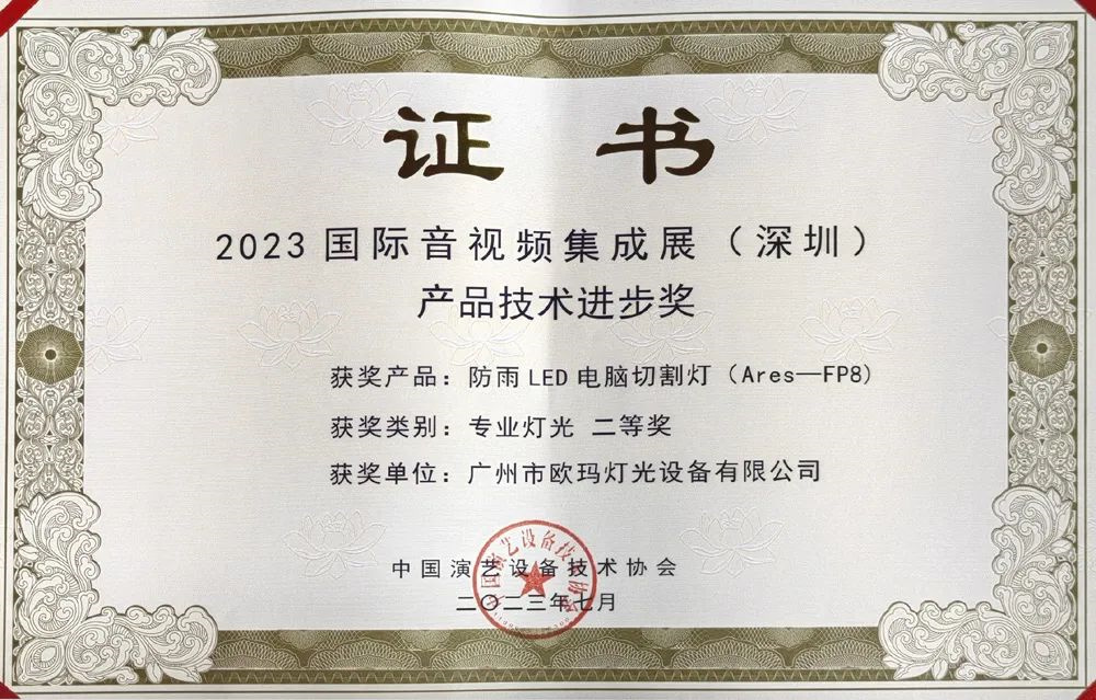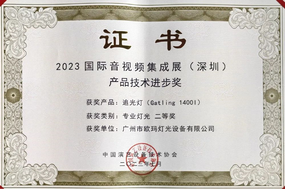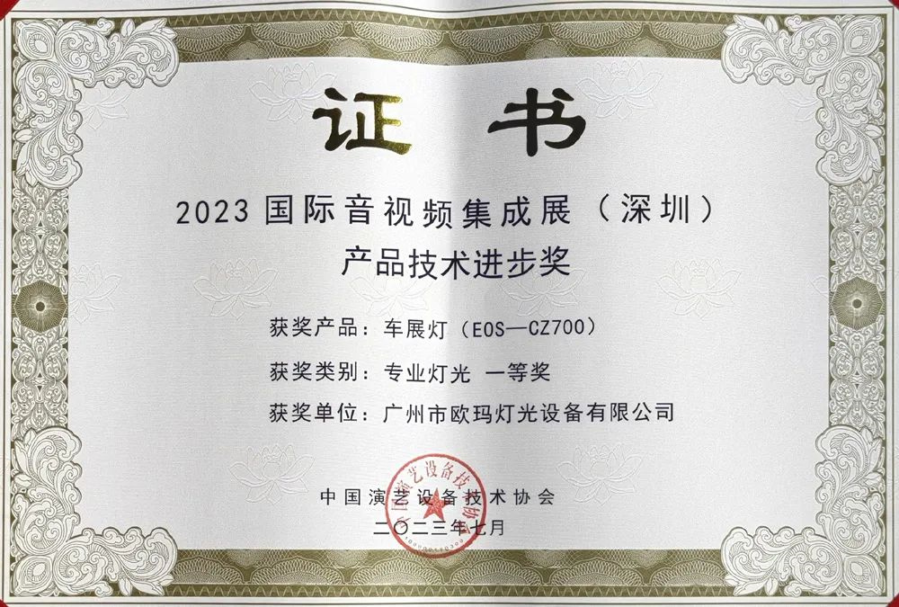 歐瑪燈光遠(yuǎn)程面光燈(GATLING 1400II)和車展燈(EOS-CZ700)評(píng)為“產(chǎn)品技術(shù)進(jìn)步獎(jiǎng)--專業(yè)燈光一等獎(jiǎng)”