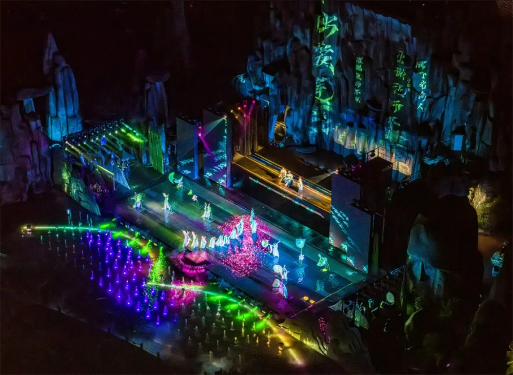 歐瑪OMARTE多款燈具,防水搖頭光束燈,防水LED搖頭切割燈,防水LED搖頭染色燈與山為背景,水為舞臺,水光融合,波光粼粼,色彩萬千,用現代科技藝術表達形式與視覺光影,同時通過場景裝置豐富演出種類形式,增強演出互動體驗感、視覺感、儀式感。