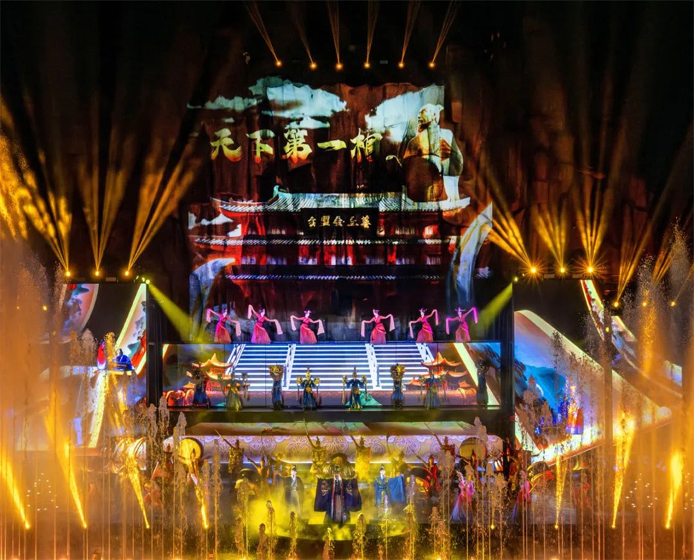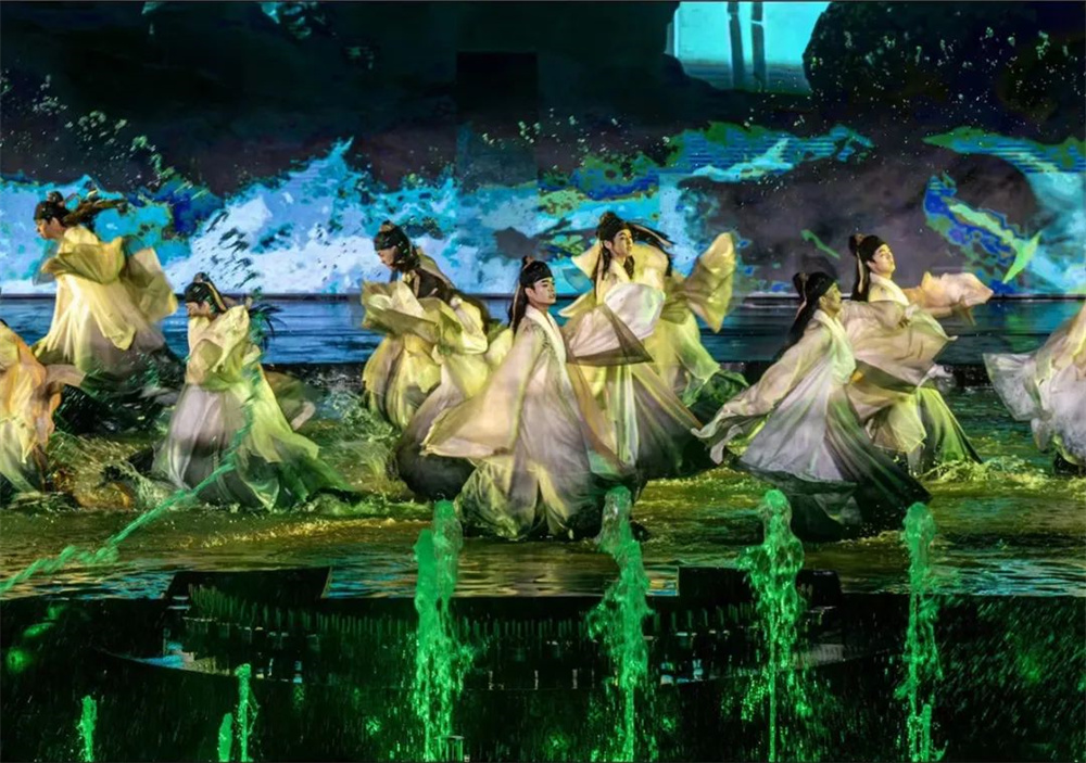 燈火璀璨,流光溢彩,身著古風演出服的演員們緩緩上前,一場以多媒體技術結合光影科技,情、景、人、秀合一的全域光影互動空間情景體驗秀;一場呈現“八里河旅游區”歷史往昔與今朝美景的皖北美學水舞光影大戲正式開始。為現場的群眾帶來一場極致的視覺盛宴!