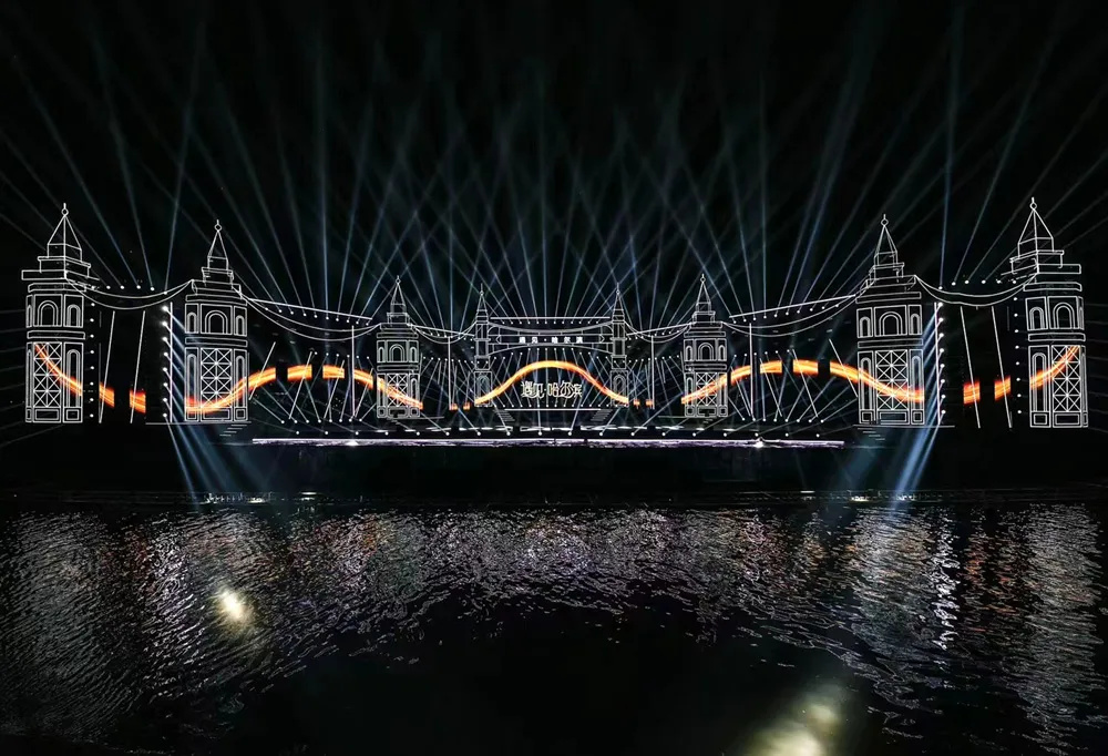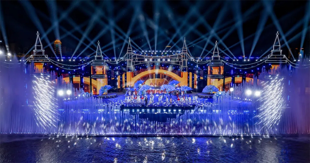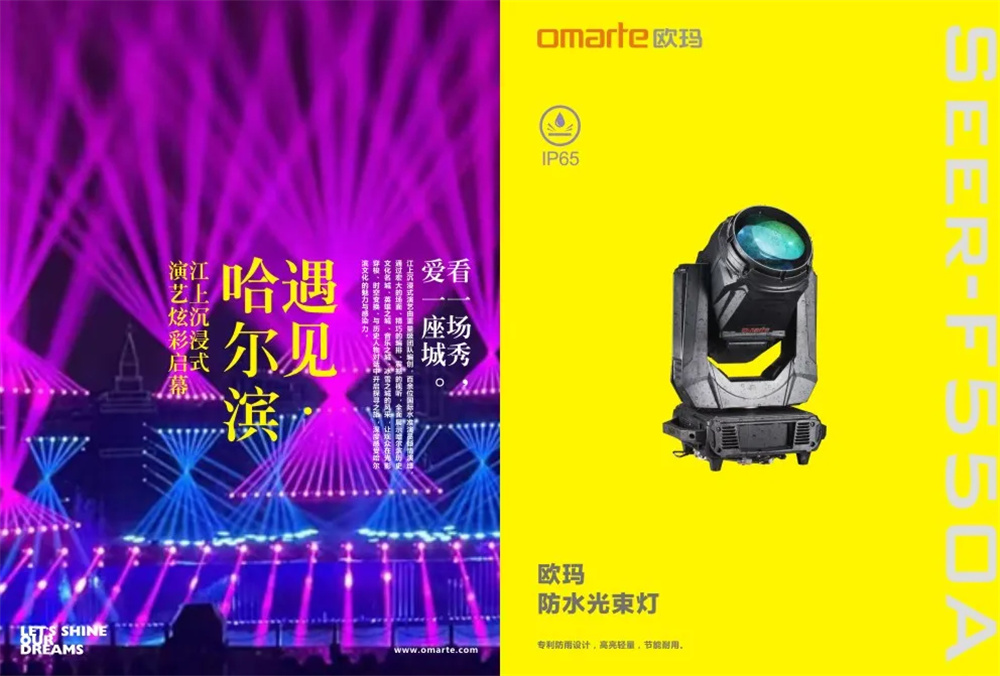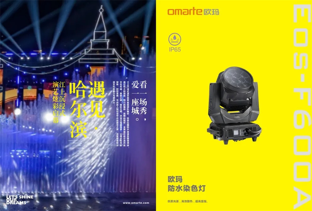 《遇見?哈爾濱》江上沉浸式演藝使用歐瑪防水切割燈、防水光束燈、搖頭染色燈近500臺。