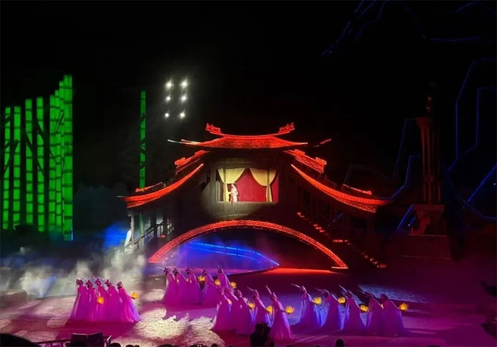 歐瑪燈光設(shè)備的卓越性能,完美實現(xiàn)了"移步換景"的沉浸式觀演體驗。當觀眾置身旋轉(zhuǎn)席間,燈光與山水實景交相輝映,傳統(tǒng)"舞臺"概念被徹底消解,取而代之的是"人在畫中行,劇在身邊生"的實景體驗。燈光與音樂的精準配合,更創(chuàng)造出"一鏡到底"的全景感官沖擊。