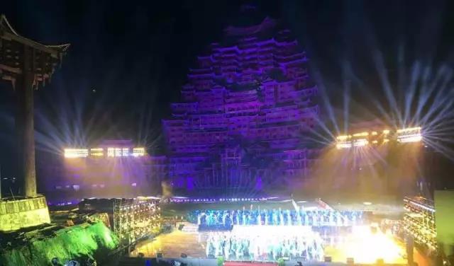 當晚的凈心谷,燈火璀璨,流光異彩,水司府在夜色的映襯下巍峨高聳,與山比肩,散發著神秘的氣息?!丢毶绞⒌洹穼嵕皠№椖恐饕ㄔO有水族山寨、人造漫山映山紅、水星空、無人機陣組合演示、道具飛機電影特效虛實煙火、水雷水炮特效爆炸、裸眼3D視頻山體秀和樓體秀等內容,360度旋轉鋼結構半圓形觀眾席能容納1500人,不僅可以360度原地旋轉,而且可以平行移動兼前行或后移,為觀眾帶來不同的視覺體驗,打破了傳統的觀演模式,屬國內標桿性的旅游演藝工程。