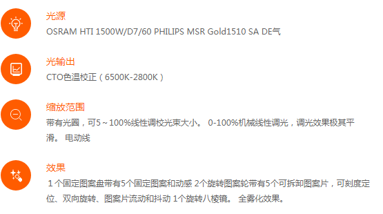 最新的OSRAM 1500w氣泡燈,顯色指數Ra>85。2個帶有5種可拆卸圖案片的旋轉圖案盤,5種固定圖案的固定圖案盤,6種顏色片的顏色盤。圖案加上顏色,再配合動感效果,可以創造出動態的投影效果。比如波光粼粼的水面,熊熊竄動的火焰等。外置系統快速升級接口,可以一次性批量升級燈具系統。自帶獨有的隱藏式折疊燈鉤專利集成系統。獲得專利的散熱系統,能很好的保護燈泡。