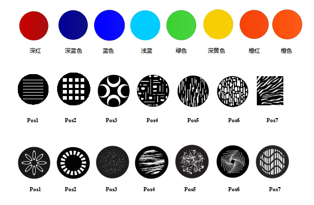 · 1個旋轉圖案盤: 7個插拔式的旋轉圖案片+空白;帶圖案抖動和任意定位功能