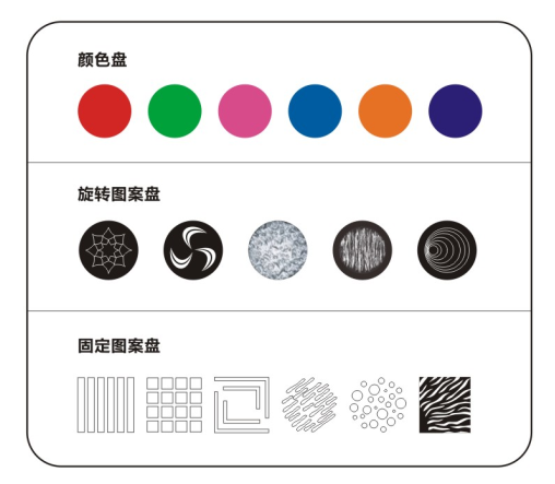 · 1個旋轉圖案輪帶有5個可拆卸圖案片,可刻度定位、雙向旋轉、圖案片流動和抖動