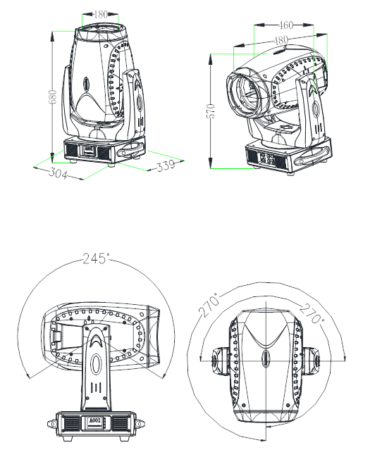 采用450W LED光源,20000小時超長壽命,配合定制的光學,能產生超強沖擊力的光束。全天候防水,防水等級為IP54。外置系統快速升級接口,可以一次性批量升級燈具系統。自帶獨有的隱藏式折疊燈鉤專利集成系統。標配五棱鏡(可定制八/十六棱鏡)、1個霧化片。電子線性調焦,調焦距離從5米到無限遠;開光角度2.8°。具有圖案定位、雙向旋轉、抖動效果,光斑均勻性好且清晰。